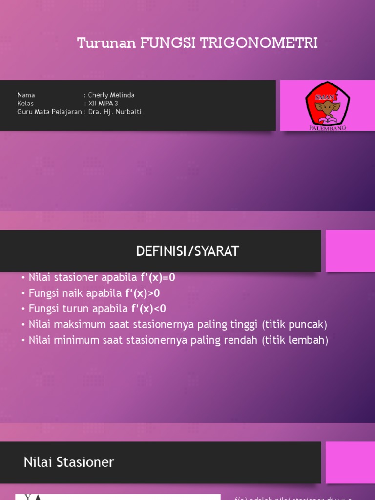 Home › Kelas XI › Matematika SMA. Selamat Datang dan Selamat Belajar di Wardaya College! Secara umum, turunan menyatakan bagaimana suatu besaran berubah akibat perubahan besaran lainnya; contohnya, turunan dari posisi sebuah benda bergerak terhadap waktu.