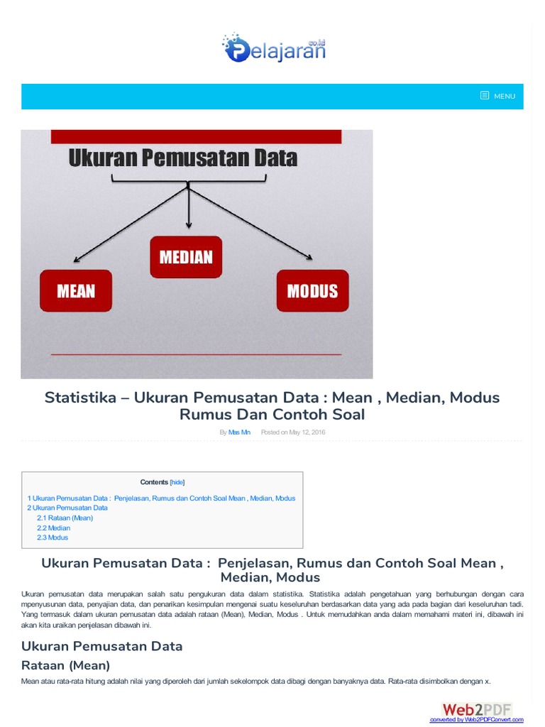 Kunci Jawaban Statistika - Modus, Median, Mean - Sanjayaops (Larry Thompson) Median adalah nilai data tengah (dengan pengertian,bahwa dari sekelompok data dibagi menjadi dua bagian yang sama dan pembagi nya disebut sebagai median). Median adalah suatu nilai tengah yang telah diurutkan. Contoh Soal Cara Unik Menentukan Median, Modus, dan Mean - Contoh Soal Statistika merupakan ilmu yang mempelajari tentang pengumpulan data, pengolahan data, penyajian data dan pengambilan kesimpulan.